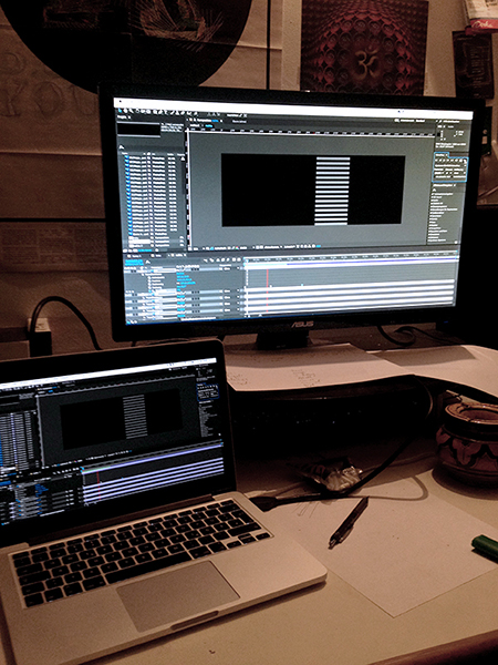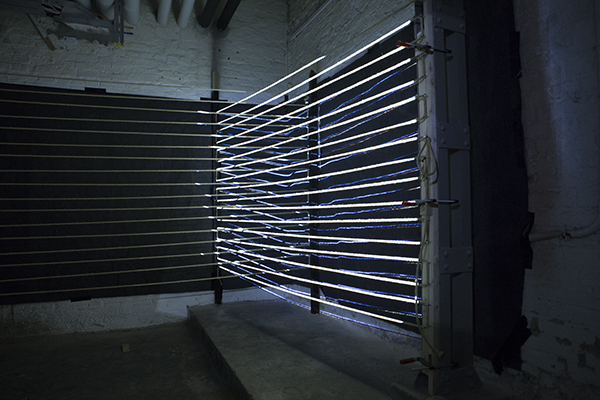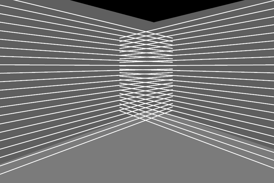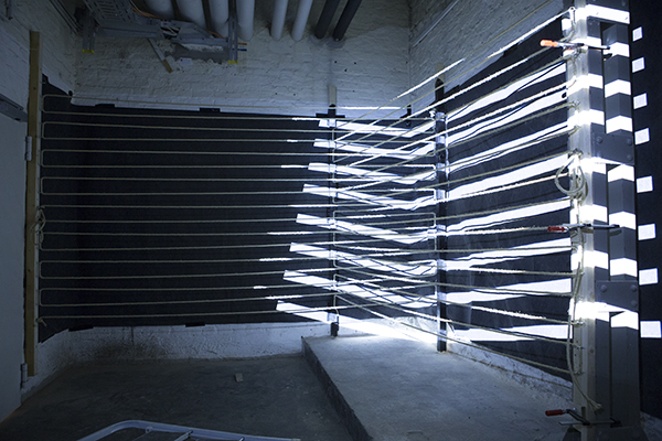 Binaural music uses a special kind of recording to create a three dimensional spatial sound. Together with Sebastian Miller, we created a room installation with mapped, horizontally taut strings for the song "Done and Gone" provided by Patrick Leuchter. We decomposed the musical piece in it‘s sounds and created a synaesthetically perceived visualisation fitting the extracted musical elements. The visual perception intensifies and alters the auditive impressions of the music, as well as the other way around. This interaction creates an emerging experience.
